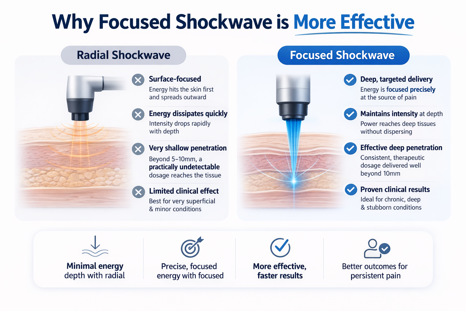 This means focused shockwave can reach deeper structures like tendons and joints more effectively